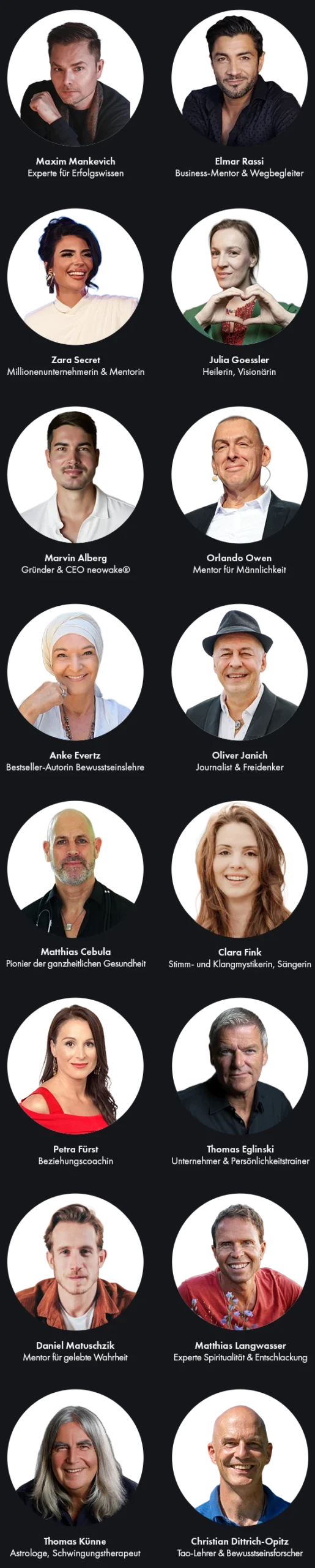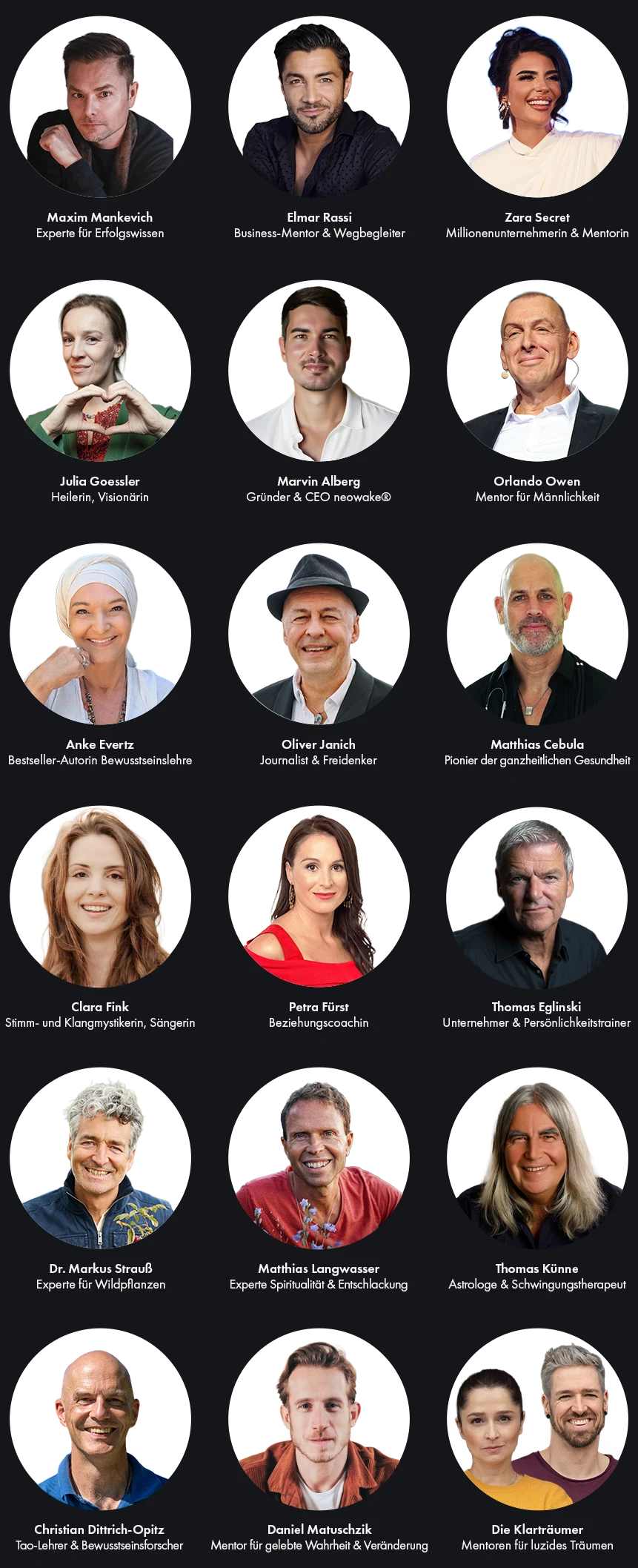 Erlebe führende Stimmen aus Neurowissenschaft, Psychologie, Spiritualität und persönlicher Entwicklung. Jeder Experte bringt nicht nur Wissen, sondern gelebte Erfahrung mit – und zeigt dir konkrete Wege, wie du alte Konditionierungen loslässt, deine Essenz erkennst und Souveränität im Alltag verkörperst.